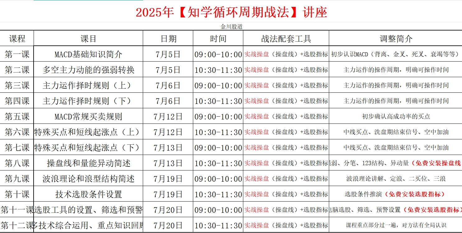 2025年第一期【循环周期战法】实战跟庄讲座将于7月5日正式开讲,它是【实战跟庄操盘】体系基础战法之一。讲座共计十二节课程,每周六、周日早上9点至10点、10点半至11点半各两节课,学期三周。凡参与学习的朋友,需要提前安装操盘线工具-【实战操盘】和选股指标(免费安装)。另外,在正式讲座开始之前,建议先观看上期讲座所录制的视频,这样有利于对本期战法讲座内容的学习和掌握。